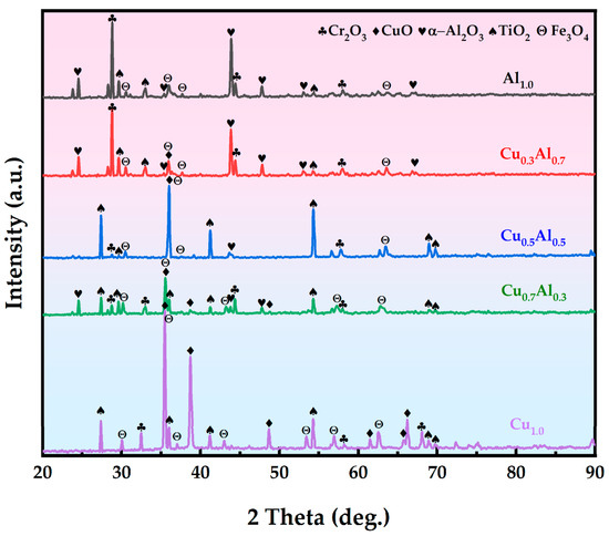 The XRD patterns of the oxidized surface of the coatings are shown in Figure 8. The results indicate that all phases on the surface of the HEA coatings are composed of various types of oxides. For the CoCrCuFeNi HEA coating, the surface oxides include CuO, TiO2, Fe3O4, and Cr2O3. As the Al content increases, the intensity of the CuO peak decreases, and the Al2O3 phase appears on the oxidized surface of the coating. Moreover, the peak intensity of Al2O3 and Cr2O3 increases with a higher Al content. For the Cu1.0, Cu0.7Al0.3, and Cu0.5Al0.5, the surface oxides are primarily CuO, Fe3O4, and TiO2, while the surface oxides of the Cu0.3Al0.7 and Al1.0 coatings are mainly Cr2O3 and Al2O3. With the increase in the Al content, the peak intensity of Al2O3 and Cr2O3 is gradually enhanced. This suggests that the addition of Al elements promotes the formation of Al2O3 and Cr2O3 on the surface of the HEA coatings. The presence of Al2O3 and Cr2O3 in the oxide layer increases the surface density of the HEA coatings, effectively preventing the inward diffusion of oxygen and slowing down the oxidation process.