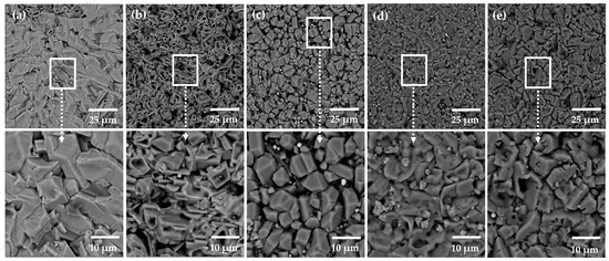 Figure 4 shows the cross-sectional SEM images of the upper and middle regions of the coatings. It can be observed that the coating exhibits a typical dendrite microstructure. When the Cu content is 1.0, a light-gray microstructure is present in the inter-dendritic regions at the top of the coating, while a butterfly-like dark-gray microstructure is observed within the dendrites. With the decreases in the Cu content and the increases in the Al content, the grains evolve from a cellular structure to a chrysanthemum-like shape and ultimately to petal-like equiaxed crystals, and gradually decrease with a small amount of dispersed black petal-like or granular precipitates. The dark-grey microstructure in the dendrites and the light-grey microstructure in the inter-dendrites show that the grain size decreases from the top to the bottom of the coating, accompanied by a reduction in the size of the black granular precipitates. In addition, as shown in Figure 4a–d, white precipitates accumulate at the grain boundaries, with their content decreasing progressively. Due to the high mixing entropy effect [45], no intermetallic compounds were found in the middle region of the coatings, which promoted the dissolution of the main components and inhibited the precipitation of the intermetallic compounds.