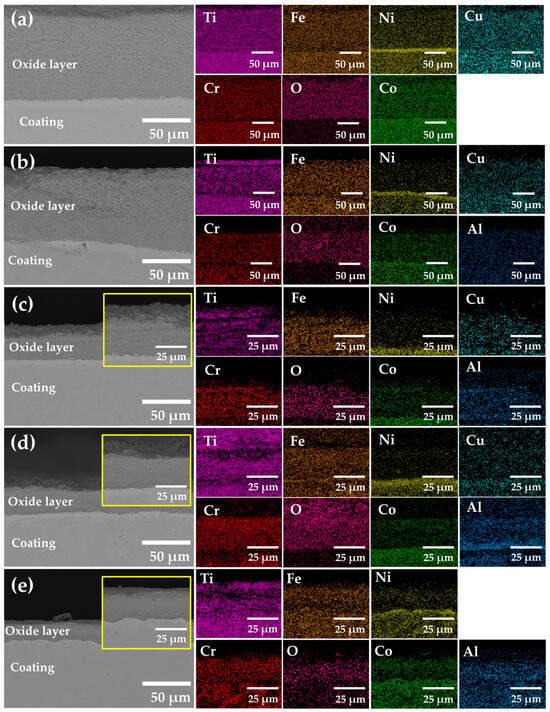 Figure 9 shows the surface morphology of the coatings after 50 h of oxidation at 800 °C, while Figure 10 presents the cross-sectional morphology and elemental distribution of the coatings. The strong bonding between the oxide layer and the substrate, without any peeling phenomenon observed, indicates a robust bonding strength at the interface. In contrast, the Ti6Al4V alloy substrate experiences severe surface oxidation, leading to a very loose and flaky oxide film, which will not be discussed further. The results show that the upper layer of the surface oxide is rich in Fe, Ti, and Cr, while the lower layer has a horizontal boundary rich in Ni and Co. During the oxidation process, Ni and Co in the oxide film diffuse and concentrate internally, forming a transition zone with a high concentration of these elements. The preferentially oxidized elements diffuse to the surface, where they combine with oxygen to form an oxide layer, while the remaining elements, such as Ni and Co, diffuse inward, aggregating to form a transition layer [2]. The diffusion rates of elements from highest to lowest are as follows: Ti, Cr, Co, and Ni [49,50]. Based on these diffusion rates, it can be inferred that Ti and Cr will diffuse more quickly than Co and Ni, leading to their preferential reaction with oxygen to form oxides. On the other hand, Co and Ni are slower to oxidize and, therefore, accumulate inward, contributing to the formation of the transition layer. This transition layer not only hinders the diffusion of elements from the coating to the surface but also prevents the inward diffusion of oxygen atoms, thereby enhancing the coating’s high-temperature oxidation resistance and protecting the Ti6Al4V alloy substrate.