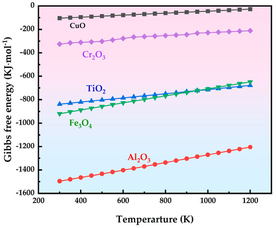 Gibbs free energy of CuO, Cr2O3, TiO2, Fe3O4, and Al2O3 with temperature.