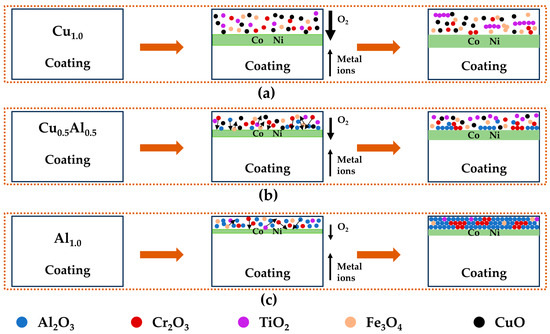 Schematic description of high-temperature oxidation of coatings [36]: (a) Cu1.0; (b) Cu0.5Al0.5; (c) Al1.0.