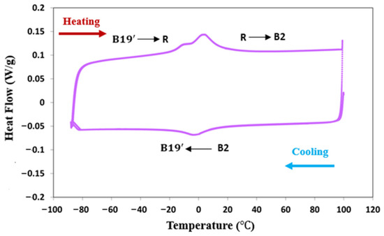 Differential scanning calorimetry (DSC) analysis was performed on the heat-treated wire to characterize its phase transformation behavior, using a TA Instruments DSC 250 (Waters Discovery, New Castle, DE, USA), employing a heating/cooling rate of 10 °C/min. Each sample was subjected to two cycles between −85 and 100 °C to ensure thorough analysis. Nitrogen was used as a protective gas to prevent oxidation during the process. The DSC curve and the corresponding transformation temperatures are presented in Figure 1 and Table 2. The heat-treated wire exhibited a single-stage transformation from the B2 austenite phase to the B19’ martensite phase during cooling. Upon heating, the wire showed a two-stage transformation, first from B19’ to the R-phase and then from the R-phase to the B2 austenite phase.