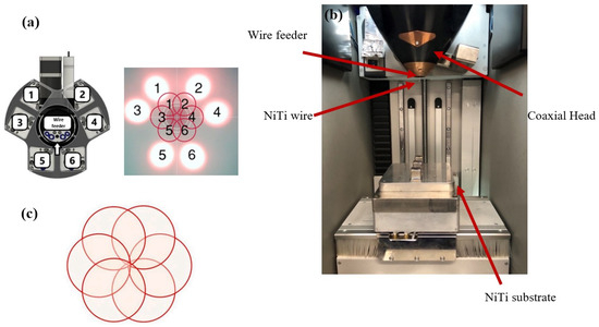 The fabrication process utilized a commercial DED printer (Meltio M450, DIRECTEDMETAL 3D, S.L., Linares, Jaen, Spain) equipped with six constant wave diode lasers, each with a power of 200 W and a wavelength of 976 nm (Figure 2a). Figure 2b shows the printing chamber, containing a substrate, coaxial wire deposition head with material supply, shielding gas nozzle, and lasers. Each individual laser beam exhibited a near-Gaussian energy distribution with a diameter of approximately 1 mm at the deposition plane (Figure 2c). The alignment of six laser beams enabled coaxial feeding and sufficient energy coverage for fully melting the NiTi wire. Laser alignment played a critical role in ensuring the quality of the printed parts and preventing defects. Therefore, periodic alignment checks were necessary to verify the correct laser positioning. Inert argon gas (25 L/min) and air conditioners were utilized to minimize oxidation and excessive heating during the laser-deposition process, maintaining a pressure of 4 bars in the print chamber. The Meltio Horizon 1.2.0 software was employed to generate the codes controlling the scanning pattern. Throughout the process, the deposition head remained stationary while the building platform was moved both laterally and vertically.