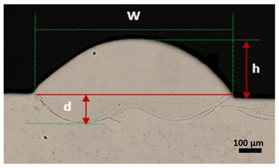 Geometrical measurements of single-track. w: single-track width; h: single-track height; d: penetration depth.