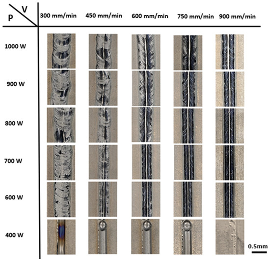 The initial assessment of single-track quality was conducted by analyzing top-view images of the scan tracks. It was observed that both laser power and transverse speed significantly influenced the stability of these tracks. Figure 4 illustrates the morphologies of thirty single tracks deposited at various laser powers (400 to 1000 W) and transverse speeds (300 to 900 mm/min), with detailed specifics outlined in Table 3. Significant variations in size and shape were observed in the single tracks as laser power and transverse speed were changed. At lower laser powers of 400 W and transverse speeds ranging from 300 to 900 mm/min, insufficient heat input prevented the wire from melting and depositing properly, resulting in the deposition of unmelted wire.