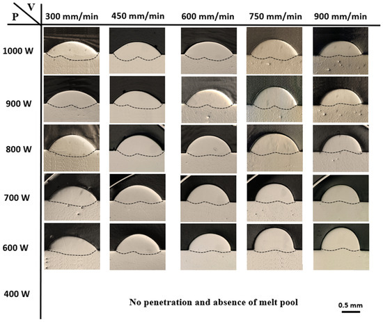 It is evident that laser power and transverse speed are the primary processing parameters influencing melt pool geometry in WL-DED. At the minimum power setting of 400 W and speeds ranging from 300 to 900 mm/min, there was insufficient energy to fully melt the wire. Consequently, only melted wire was deposited onto the NiTi plate without proper contact with the substrate, resulting in no penetration and the absence of a melt pool.