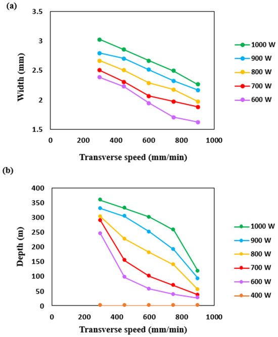 Effect of laser power and transverse speed on: (a) the width of single tracks and (b) the depth of the melt pool.
