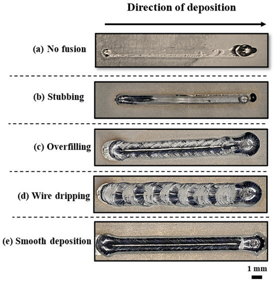 The evaluation of single-track quality was classified as either “acceptable” or “defective”, based on track morphology and melt pool dimension. Five distinct states were identified: a regular and smooth region, and defects including no fusion, stubbing, overfilling, and wire dripping. Figure 7 illustrates top-view optical microscopy (OM) images of single tracks representing these five states, providing a detailed classification of each. No fusion (Figure 7a) occurred due to insufficient energy input, resulting from low laser power and high transverse speed (400 W and 900 mm/min). In these cases, no visible scan track was formed on the substrate, and only heat treatment was applied based on the ablation trace [66]. Stubbing (Figure 7b) occurred in tracks printed with an energy density ranging from 26.66 to 53.33 J/mm (using a low laser power of 400 W and transverse speeds from 450 to 900 mm/min). In these cases, the wire made contact with the base plate surface but did not receive enough energy, resulting in unmelted wire residues within the track [48,67].