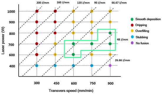 To prevent detrimental defects in builds, it was crucial to define the boundaries of four defect-generation mechanisms on the printability map. This ensures precise identification of the optimal, smooth printable region for WL-DED processing of NiTi. Figure 8 presents the full process window, highlighting both defective and stable regions. Notably, process stability is achieved only within a limited portion of the experimental range. It was found that a minimum laser power of 600 W was necessary to enter the stable zone. Notably, equivalent levels of linear energy density could lead to either defective or successful deposition conditions. For instance, when the linear energy density exceeded 66.67 J/mm, the deposition conditions shifted from defect-prone to successful. However, decreasing both power and transverse speed subsequently led to stubbing. Similarly, maintaining constant power while reducing transverse speed resulted in defective deposition, eventually causing wire dripping. These observations are consistent with findings from previous studies on laser metal wire DED with lateral feeding [67].