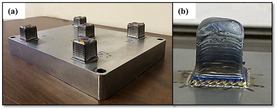 The cubes printed using the optimal single-track processing parameters, as specified in Table 4, exhibited a smooth surface finish and uniform shape with minimal discoloration on both the top and bottom surfaces, as shown in Figure 9a. This discoloration results from varying cooldown rates across the parts; the outer shell experiences more oxidation than the inner areas because it cools more slowly in non-argon shielded regions after each layer is printed. Despite this, the cubes predominantly exhibit a silver color, indicating a low degree of oxidation [70]. Figure 9b illustrates an example of a defective cube printed with a power of 900 W and a transverse speed of 600 mm/min. As observed, the high energy input cause thermal energy to accumulate in the material, leading to overheating. This overheating results in defects such as porosity, high surface roughness, and dimensional inaccuracies [71].