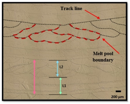The cross-sectional analysis of the melt pool reveals the track lines and melt pool boundaries, as indicated by the black dashed lines (Figure 10). The cubes were cut parallel to the building direction, providing insights into the melt pool characteristics during layer-by-layer deposition. The printing strategy initiated from the longest diagonal of the square, creating a triangular pattern that progressed towards one side, then returned to the center, continuing in this manner. This pattern is reflected in the shapes of the melt pools, as shown by the dashed red line.
