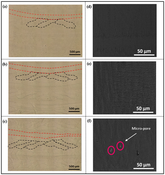 Increasing the energy density to 70 J/mm3 resulted in a deeper melt pool, indicating a higher degree of melting and material flow (Figure 11c). However, the excessive energy input caused irregular melt pool shapes and boundaries. At high energy densities, excessive melting of the material can lead to instabilities and irregularities in both the melt pool shape and fluid flow behavior. It is important to note that the wire laser DED process involves dynamic and complex interactions between the melt pool, laser, and wire. The stochastic nature of these interactions can introduce randomness and variability in the melt pool characteristics, even at the same energy density [73]. This inherent variability highlights the importance of carefully controlling and optimizing the process parameters to achieve consistent and desirable melt pool geometries. Scanning electron microscopy (SEM) analysis was performed at the center of each cube to evaluate surface quality and identify potential defects in the fabricated NiTi cubes across a range of investigated energy densities. As shown in Figure 11d–f, SEM micrographs of cube printed at energy densities ranging from 46.66 J/mm3 to 56 J/mm3 displayed defect-free surfaces, with no visible pores or cracks. This observation suggests that these energy densities promote optimal melt pool dynamics and material flow, resulting in a well-consolidated and homogeneous surface microstructure. However, at a higher energy density of 70 J/mm3, a distinct transition occurred. The corresponding SEM image (Figure 11f) revealed the formation of micro-pores on the surface of the printed cubes.