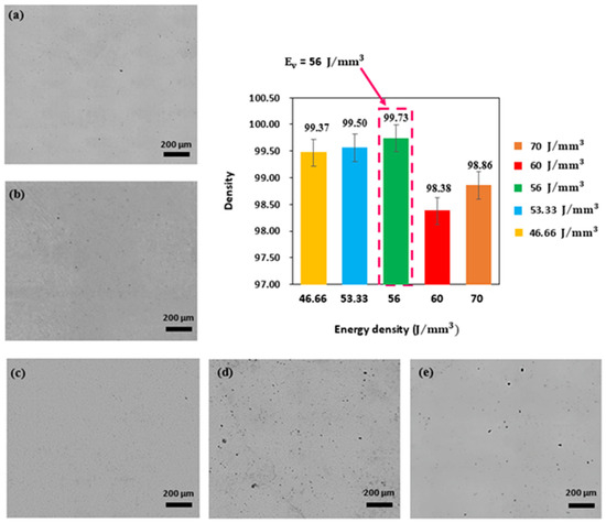 Relative density of WL-DED NiTi parts as a function of energy density (VED): (a) 46.66 J/mm3, (b) 53.33 J/mm3, (c) 56 J/mm3, (d) 60 J/mm3, and (e) 70 J/mm3.