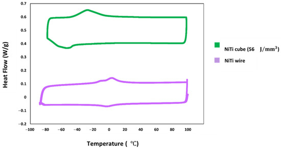 The impact of the laser direct energy deposition (DED) process on the phase transformation behavior of NiTi was investigated by comparing the transformation temperatures (TTs) of the as-received NiTi wire feedstock with those of a fabricated, dense NiTi cube. Figure 13 shows the DSC curve, highlighting a notable difference between the TTS of the NiTi wire and the dense cube fabricated with an energy density of 56 J/mm3. The NiTi wire exhibited a two-stage transformation during heating, while the printed cube demonstrated a single-stage transformation in both the heating and cooling cycles. This shift in phase transformation behavior can be attributed to the specific conditions encountered during the DED process. Localized heating from the laser beam caused rapid melting and solidification cycles within the deposited material, altering its microstructure compared to the as-received wire. Additionally, the layer-by-layer deposition characteristics of DED introduced residual stresses and thermal gradients within the printed cube [76]. These internal stresses influenced the material’s phase transformation behavior, as evidenced by the variations observed in the DSC curves.