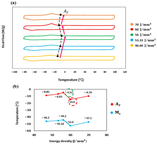 (a) DSC curves of the fabricated cube across a range of energy densities from low to high and (b) transformation temperatures (Af and Ms) of the fabricated cube.