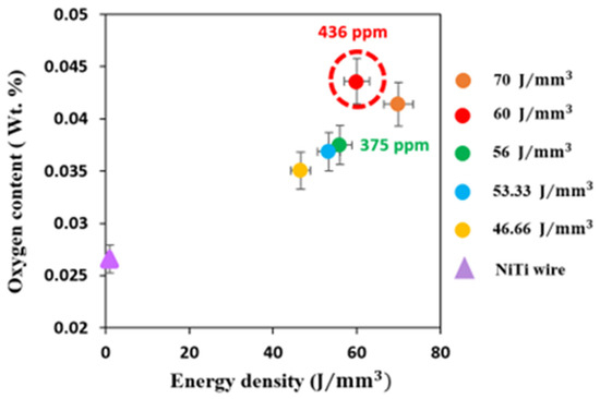 Oxygen pick-up of the fabricated cubes with different energy density.