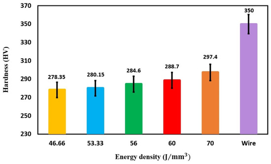- A correlation between increasing energy density and hardness was observed, with higher energy densities leading to greater nickel evaporation and a relative increase in titanium content. The printed NiTi cubes exhibited a hardness of approximately 290 HV, lower than the 350 HV of cold-drawn NiTi wire, due to the absence of work hardening and the effects of localized heat treatment during laser processing.