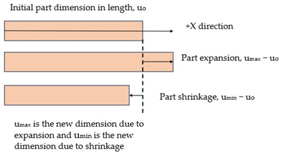 In the post-processing section, a warpage measurement has been conducted in this research (Figure 5). A displacement of the initial dimension coordinate was measured to find out the warpage in the part. The variation u represents the displacement along the X direction in the coordinate system. The linear shrinkage is defined by the maximum displacement divided by the part’s original dimension Lx.