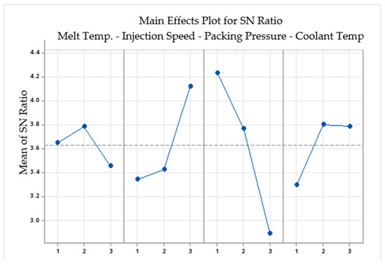 Figure 6 shows the main effect plot of all four parameters. It shows the effect of different levels and their relationship to the defects. Injection speed and packing pressure levels have a great effect on reducing warpage defects in this part. On the other hand, melt temperature and coolant temperature levels have a low effect on reducing warpage in polycarbonate molded parts.