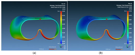 Post-processing of warpage displacement on the simplified goggles model (a) the best optimum setting for minimum warpage displacement (0.559 mm) and (b) the highest warpage displacement in the product (0.749 mm).
