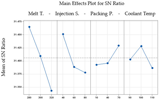 Figure 8 shows the main effect plots for the part weight SN ratio. It shows how those factors affect different levels of output. It looks like the melt temperature has a great effect on part weight. Also, injection speed looks like a promising factor for part weight optimization. However, packing pressure and coolant temperature do not have much effect on part weight.
