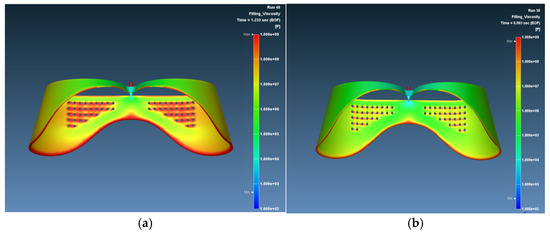 Viscosity distribution on the products to visualize part weight or potential short shot effects (a) the case 1 viscosity distribution and (b) case 8 viscosity distribution.