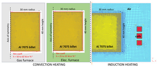 In the case of induction coil heating, a bespoke induction heating framework was developed, whereby the representative induction coil cross-section, workpiece cross-section, and a meshed workpiece around it all to represent the air were constructed. A considerably finer element size was used at the air-to-workpiece interfaces to capture in greater detail the heat being inducted into the skin of the aluminium billet. For the induction heating model, the air was required to be meshed and assigned a thermal conductivity of 1 W·m−1·K−1 and electrical resistivity of 1.3 × 1016 Ω·m−1. Mechanical boundary conditions to apply a floor beneath each billet were applied to prevent motion. A simplistic FE infrared heating model was not feasible as the process does not see heated air convection temperatures at a solid body interface—the air does not get heated during infrared methods. Thus, the multiphysics required are not implemented in the DEFORM FE code. Research has been conducted on infrared heating simulation [17], although it has not been implemented within this work. All meshes and modelling frameworks for the heating models can be seen in Figure 3.