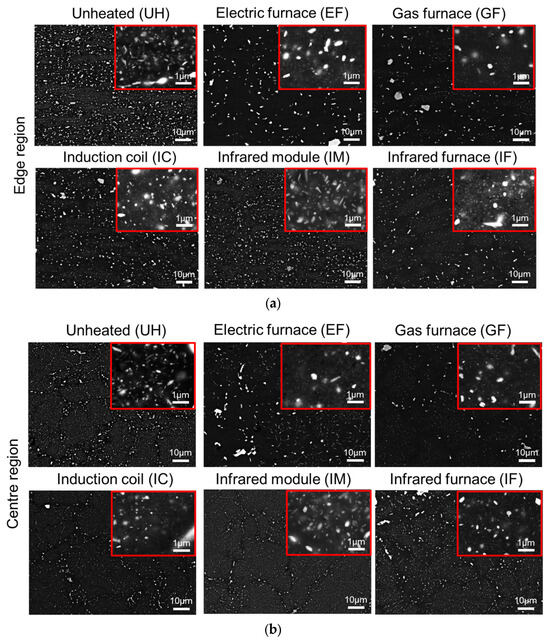 Figure 4 illustrates the SEM BSE images captured in the edge (Figure 4a) and centre (Figure 4b) regions of all samples. For simplicity, the abbreviations for the heat treatment types of the samples, as denoted in Table 1, will be used hereinafter. The as-received UH sample exhibits a typical overaged microstructure for the 7xxx series [6,19], characterised by a high density of coarse, medium-sized second-phase particles visible in the high-magnification images of both edge and centre regions.