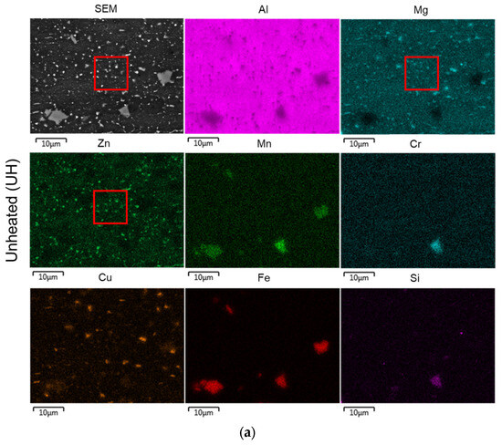 EDS mapping of the major elements present in the second-phase particles of the (a) unheated (UH) sample and (b) electric furnace (EF) heated sample. Red boxes indicate medium-sized particles which were rich in magnesium and zinc contents.