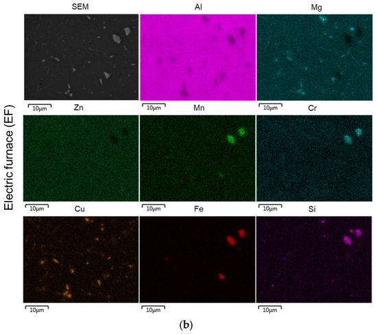 Figure 5 compares the EDS mapping in the edge regions of the UH sample, which was observed in the overaged condition, and EF samples in which the medium-sized particles were mostly dissolved. One notable distinction observed is that the medium-sized particles in the UH sample were rich in magnesium and zinc contents (as exemplified by the red squares in Figure 5a), in contrast to the EF sample (Figure 5b), where magnesium only existed in the larger, undissolved intermetallic phases, and zinc was undetectable. This observation aligns with the SEM observation, indicating the complete dissolution of the medium-sized η phase (MgZn2) particles. Another study similarly reported the presence of Mg- and Zn-rich particles, which were identified by EDS mapping following the T6 and T73 heat treatments [12]. Consequently, the ultrafine re-precipitated particles in the EF sample remained below the detection threshold of the EDS analysis.