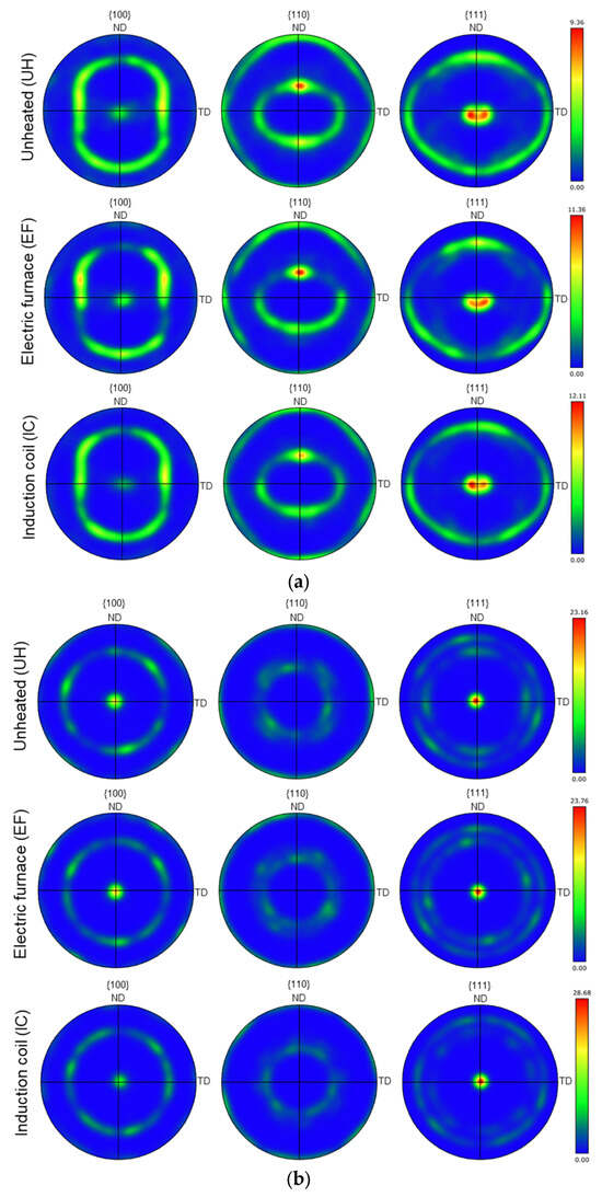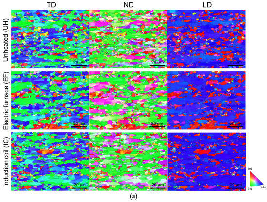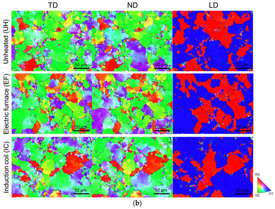 For the EBSD analysis, the comparisons focus on the most representative methods: the conventional EF method, identified through SEM as achieving complete solution treatment, and the novel IC method, which demonstrated significant dissolution of precipitates under rapid heating conditions. These two methods are compared with the benchmark unheated sample (UH) to evaluate whether the substantial differences in heating rates and hold times between EF and IC result in observable changes in grain structure. For the edge regions (Figure 6a), the higher proportion of blue-coloured <111> grains in the TD map at the edge, compared to the centre, suggests a stronger influence of shear deformation near the billet surface. This is likely due to the friction and shear as the material passes through the original manufacturing route extrusion die, leading to a slightly different texture than in the centre region. The presence of smaller, more elongated recrystallised grains with a higher aspect ratio at the edge region further supports this, as they indicate more intense deformation compared to the centre region. In contrast, the centre of the billet experiences significantly less shear deformation, resulting in larger grains with lower aspect ratios exhibiting grain morphologies similar to those observed in the 7075 alloys in the as-received condition [3]. Similarly, the grain sizes or morphology sizes in the edge region were not affected by the heat treatments.