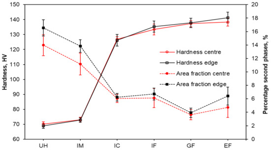Comparison of the Vickers hardness and the percentage of the second phase particles in the edge and centre regions of all samples. Error bars represent standard errors. UH, IM, IC, IF, GF, and EF denote the unheated sample and samples heated by an induction coil, infra-red module, infra-red furnace, gas furnace, and electric furnace, respectively.