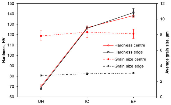Comparison of the Vickers hardness and the average grain size in the edge and centre regions of all samples. Error bars represent standard errors. UH, IC, and EF denote the unheated sample and samples heated by an induction coil and electric furnace, respectively.
