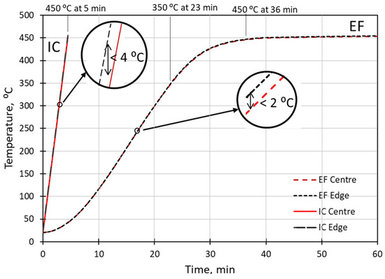 Due to the high thermal conductivity of 7075 aluminium alloy and small billet size, there were only very minor temperature differences predicted by FE between the centre and the edge of the billet during the heating process for all types of heating methods, as shown in Figure 10. For the induction coil (IC) model, the centre was typically cooler than the edge by up to 5 °C, as shown in Figure 10. Note that in the IC model, the operator cannot allow the sample to soak at the target temperature for a period of time. Once the outer edge is measured at 450 °C by the thermocouple probe kit, reaching the target temperature, the power is cut to the induction unit. This means that when the power to the induction unit is cut, the central region of the IC billet is predicted to be roughly 5 °C cooler than the target soaking temperature, and the centre is unlikely to ever reach the target temperature.