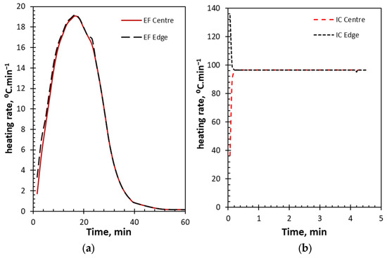Predicted heating rates at the centre and the edge of the billet during the heating process for (a) electric furnace (EF) and (b) induction coil (IC) heating methods.