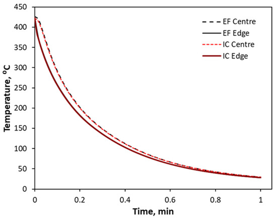 In the FE model, no transfer time or changing thermal convection coefficient to represent the sample being moved through the air from the furnace to the quench tank was considered. The last thermal profile from the heating phase was simply passed into the quenching model to be the starting condition for the quench. During the quenching operation, predictably, all the different heating methods used display virtually identical cooling rates for a given location within the billet, as these cooling rates are purely a function of the starting temperature and the heat transfer during the quenching operation; see Figure 12. The preceding heating operation to obtain the samples up to the target 450 °C was considered largely immaterial as they all reached the approximately uniform target temperature, within 5 °C.