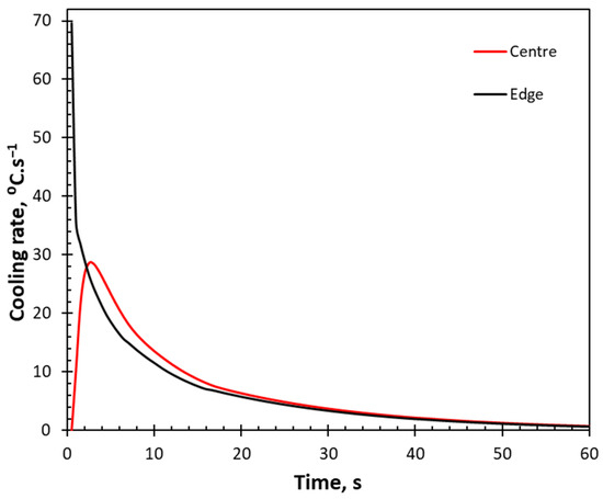 The instantaneous cooling rates were computed by differentiating the temperature versus time curves during the quench, as shown in Figure 13. The peak cooling rate at the outer edge was approximately 70 °C·s−1, occurring at the very start of the quench. In contrast, the peak cooling rate at the centre of the billet was significantly lower, at only 29 °C·s−1, occurring approximately several seconds into the quench.