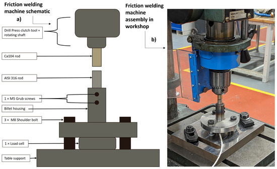 Joining of dissimilar materials has been a long-lasting endeavour for engineers due to the material’s inherent differences in physical, mechanical, metallurgical, and thermal properties [1,2,3]. There has been an increased research interest for nuclear energy applications [4,5,6,7] of joined stainless steel and copper alloys. These sectors can greatly benefit from combining high strength, low thermal diffusivity, with high corrosion resistance, thermal and electrical conductivity. However, the materials’ metallurgical incompatibility (solubility limits, solidification patterns, etc.) create challenges in their joining efforts [8]. Fusion-based welding processes present difficulties due to the varying properties of the materials involved [9,10]. Solid-state processes, however, maintain the integrity of the parent workpieces without requiring lower-grade filler metals usually found in fusion welding [11]. Rotary friction welding (RFW), a variant of friction welding, is a well-established solid state joining process, proven capable of producing high-quality welds between workpieces of similar and dissimilar materials [12,13,14]. It is a technique frequently employing large industrial-scale machinery that is designed to convert mechanical energy into heat at the contact surfaces of the workpieces, with the help of an applied relative motion. Limited access to full-scale machinery restricts the range of research projects capable of utilising the fundamentals and advantages of friction welding. Thus, the need to investigate potential new outlets to design and develop small-scale, low-cost friction welding experimental setups with existing workshop machinery is created. This is further driven by the need to explore dissimilar materials compatibility for applications in demanding environments.