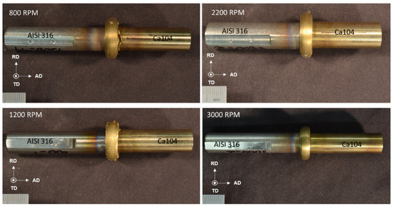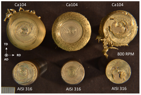 Visual inspection of the stainless steel workpieces shows a discoloration near the contact area, with flash formed from the Ca104 side as seen in Figure 3. On average, the Ca104 rods experienced a total length reduction of approximately 7.3 mm from the initial 50 mm. There was no increase in upset and flash formation with the higher rotational speed joints.