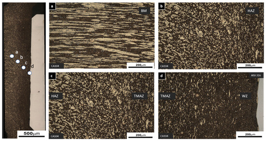 The microstructure of the weld produced at 800 rpm is presented in Figure 4 in the axial direction (AD). The investigation is focused on the Ca104 side and not the AISI316 due to the former showcasing visible signs of deformation and change in microstructure. Grains in the BM exhibit linear directionality, seen in Figure 4a, and, as seen in Figure 4b,c, their elongated morphology has been transformed into fine spheroids towards the HAZ and TMAZ. The grain boundaries between TMAZ and WZ on Figure 4d are not as identifiable as in the BM (Figure 4a), due to the material becoming highly deformed, exhibiting martensitic structures as a result of fast cooling rates in the WZ towards the stainless steel side.