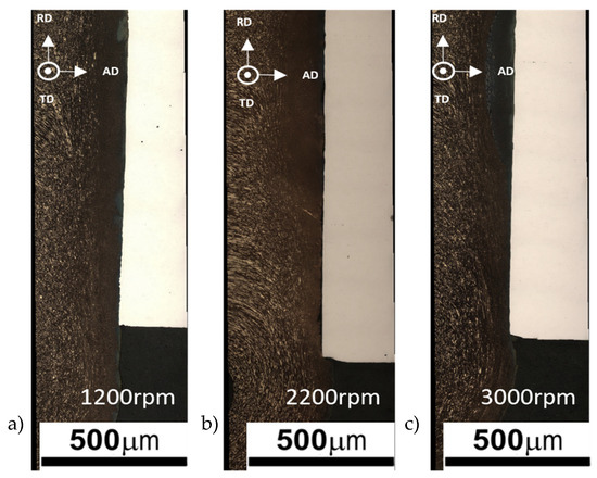 Microstructure of welds conducted at 1200, 2200 and 3000 rpm, respectively (a–c). AD, TD and RD refer to the axial, radial and transverse directions, respectively
