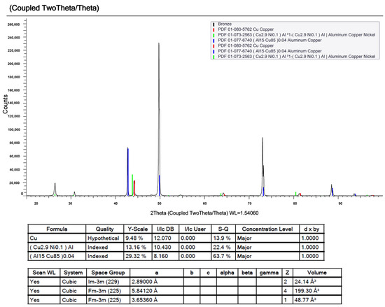 XRD analysis was employed to determine the space groups of the identified crystal structures on the aluminium bronze side, which are provided in Figure 6. This analysis has helped identify the current phases found in both the BM and WZ as shown in Figure 7a,b. Within the three-dimensional micellar sphere packing, there are three identified space groups that are correlated to a specific crystal structure [32]. Im-3m is a BCC structure, Fm-3m is FCC and P63/mmc is HCP. The space groups identified on the Ca104 workpiece are two, Im-3m and Fm-3m, indicating the existence of both α phase with an FCC and β phase with a BCC crystal structure, as reported by Xu et al. [33]. The existence of these phases can significantly alter the corrosion resistance of the aluminium bronze alloy [29,34]. In addition to the existing phases, metastable intermetallic k particles are present, scattered throughout the microstructure of Ca104, which are directly correlated to the dynamic softening of the material that is recorded [33]. The existing phases in the crystal matrix and the additional particles are identified in Figure 7.