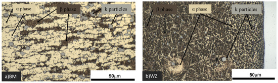 Micromorphology of aluminium bronze in the BM (a) and WZ (b).