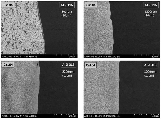 SEM micrographs of the friction welds at the interface where the EDS line analysis was taken: 800 rpm, 1200 rpm, 2200 rpm and 3000 rpm, respectively.