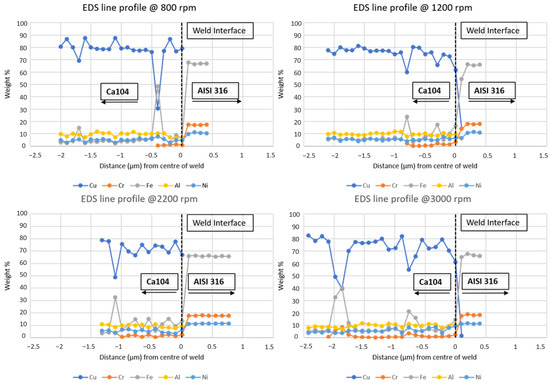Elemental diffusion can be considered to be a complimentary bonding mechanism in friction welding of metallic systems [11,35,36,37] and the evidence of it can demonstrate a higher-quality weld [11,37,38]. SEM images and the location of the line scan analysis performed at the weld interfaces of the AISI316 to Ca104 rotary friction welds are provided in Figure 8. Each data point of the scanned lines has been plotted in Figure 9, for each element identified in both materials, as described in Table 1 and Table 2. The penetration of Cr and Fe, respectively, is measured to a depth of 0.5–2.3 μm from the AISI316 side to the Ca104 side. In contrast, no traces of Cu or Al can be found on the AISI316 side, signifying that the temperatures generated at the interface were not high enough to create diffusion conditions for the stainless steel side. This can be linked to the limitations of the suggested friction welding setup. Studies have presented indicative temperatures where Cu has been found to diffuse into stainless steel as high as 950 °C [36,39], while Cr can diffuse into Fe-Cr systems as low as 600 °C [40,41,42]. Out of all the welds investigated, the one produced at 3000 rpm showcased the deepest penetration of Cr and Fe from the AISI316 to the Ca104 side at a depth of 2.2 μm. This can be linked to the fact that the higher rotational speed on the interface is directly correlated to a higher heat input between the workpieces, suggesting higher temperatures generated while welding. The opposite is found for the weld at 800 rpm, where the Cr diffusion can be found at depths of 0.5 μm, i.e., a decrease of 77.72%.
