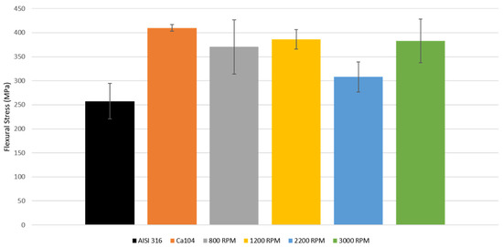 The flexural strength of the dissimilar material welds was examined by subjecting samples to a 4-point bend testing regime. The flexural strength of each weld was measured, and their average value was compared to that of the BM, as seen in Figure 10. The 4-point bend test results were examined in sets of three samples per set of welding parameters. For every set of parameters, all samples failed at the weld interface of both workpieces with relative homogeneity, as seen in Figure 11 at 800 rpm, while displaying a higher flexural strength than that of AISI316 with a mean value of 258 MPa. The samples showcase uniform brittle failure with micro-traces of Ca104 on the AISI316 workpieces. Amongst the four examined sets, the welds joined at 1200 rpm exhibited the highest average flexural strength of 386 MPa, while the welds joined at 2200 rpm had the lowest average flexural strength of 308 MPa. Ductility measurements taken from all examined welds showcased no additional increase for that of the base materials. Contrary to maximum diffusion correlation with highest rpm, maximum bond strength does not occur at highest rpm due to the other material interdependencies. This is again supported by the statement that diffusion bonding is an aspect of complete metallurgical bonding between dissimilar alloys [43,44].