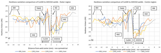 The hardness distribution of AISI 316 to Ca104 rotary friction welds for each set of parameters is represented in Figure 12 for the outer region and centre region along the axis of the welded joint. The hardness values of the parent materials are measured within the range of 190–220 HV for AISI316 and 195–210 HV for Ca104. Both graphs follow a similar trend of hardness evolution with the only difference found in the outer region (Figure 12a), where all four welds experienced a steeper increase from the HAZ to TMAZ on the Ca104 side. The finer-grained microstructure that is found in the TMAZ and WZ of the Ca104 was responsible for the highest hardness values. This hardness increase can be attributed to the grain refinement experienced by the material as a result of dynamic recrystallisation which has been reported in similar studies [45,46,47], further supported by the microstructure changes presented in Figure 4. Furthermore, there is a decreasing trend from the weld’s centre towards the parent material, with a steep transition between the WZ, TMAZ and HAZ. The maximum hardness in the WZ from the Ca104 side was measured at 268, 255, 277 and 270 for 800, 1200, 2200 and 3000 rpm, respectively, indicating minor changes in hardness with increasing rotational speed. Nevertheless, a decrease in rotational speed led to a lower generation of heat that may result in a smaller fraction of grain refinement and conservation of the original microstructure in the WZ post-cooling (i.e., higher ductility, decreased hardness).