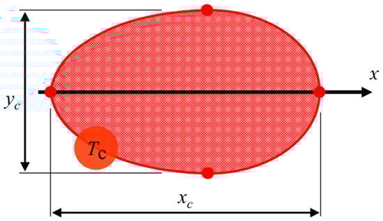 The size and shape of characteristic isotherms are essential in evaluating whether the heat source is moving fast or slow [], while the geometry of the melting isotherm significantly impacts key factors such as weld seam shape and metallurgical dilution []. Additionally, the isotherm shape affects the relative magnitude of gradients within the thermal stress field, with steep gradients perpendicular to the heat source movement enabling the simplification of thermal and residual stress models to uniaxial assumptions []. Consequently, an overall aspect ratio AR = xc/yc can be determined for the isotherm Tc associated with the region of interest for describing the shape as a non-dimensional parameter, as shown in Figure 1. The AR parameter together with the dimensionless Rosenthal number Ro (Equation (1)) can be used for classifying the welding heat sources applied during manufacturing. The Rosenthal number is calculated as follows, assuming two-dimensional (2D) heat transfer for thin-walled sections: