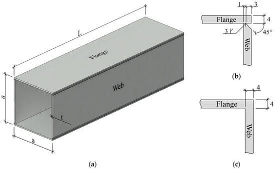 Geometry and dimensions of analyzed box sections are denoted in Figure 3a. Corner joints for the welding simulation (using edge preparation and single-bevel butt weld with broad root face and one weld pass), and the simplified local heating (without filler material addition), are shown in Figure 3b,c. Widths and wall thicknesses of both flange and web are a = 200 mm, and t = 4 mm, respectively. All the specimens have identical cross-sectional dimensions, consequently, the width-to-thickness ratio of the constituent plates is 50 in all cases. Length L of the simplified model is 700 mm, while it is 1200 mm for the welding simulation. Different lengths are applied to account for the different aspect ratios considering the first yield temperature. A higher heat input is used for welding, therefore, the region of interest (i.e., size of the isotherm denoting the first yield temperature) would not fit on the specimen with a length of 700 mm.