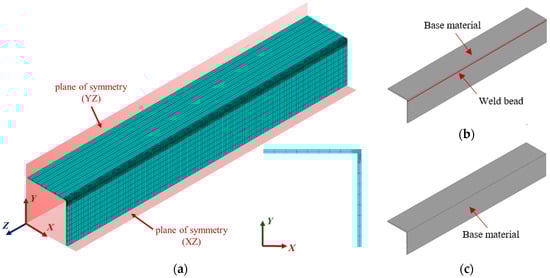(a) Used finite element mesh with boundary conditions, and element groups for (b) welding simulation (Tmax > Tzs) and (c) simplified model (Tmax < Tzs).